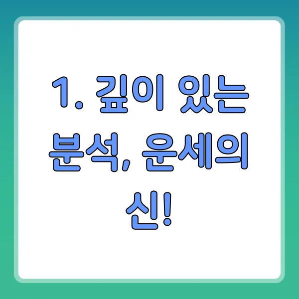 운세의 신은 깊이 있는 분석을 원하는 분들에게 딱! 맞는 사이트예요. 단순히 오늘의 운세만 보는 것을 넘어, 나의 강점과 약점, 그리고 미래에 대한 방향성까지 제시해주니까요! 신년 운세처럼 장기적인 계획을 세울 때도 참고하기 좋답니다. 새해 목표 설정에 큰 도움이 될 거예요!💯 특히 사주명리학에 관심 있는 분들이라면 더욱 만족하실 겁니다. 전문가의 꼼꼼한 해석을 통해 사주와 운세에 대한 이해를 높일 수 있으니까요!