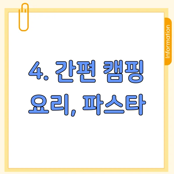 - 면 삶기 : 파스타 면은 캠핑 가기 전, 미리 삶아 올리브오일🫒에 버무려 가져가면 시간 절약!☝️ 삶을 때 소금을 넣으면 면에 간이 배어 더 맛있어요!
